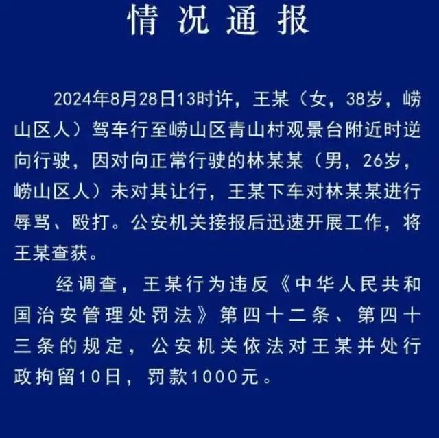 前几天,青岛市公安局崂山分局发布通报,对逆向行驶且对他人进行辱骂、殴打的王某处以行政拘留10日,罚款1000元的处罚。