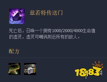 1. 所需材料:反曲之弓和巨人腰带。2. 合成步骤:将反曲之弓和巨人腰带放入装备栏中,它们会自动合成兹若特传送门。3. 效果:兹若特传送门的效果是佩戴者死亡后,召唤一个拥有1000/2000/4000生命值的虚灵,虚灵可嘲讽附近所有的敌人。