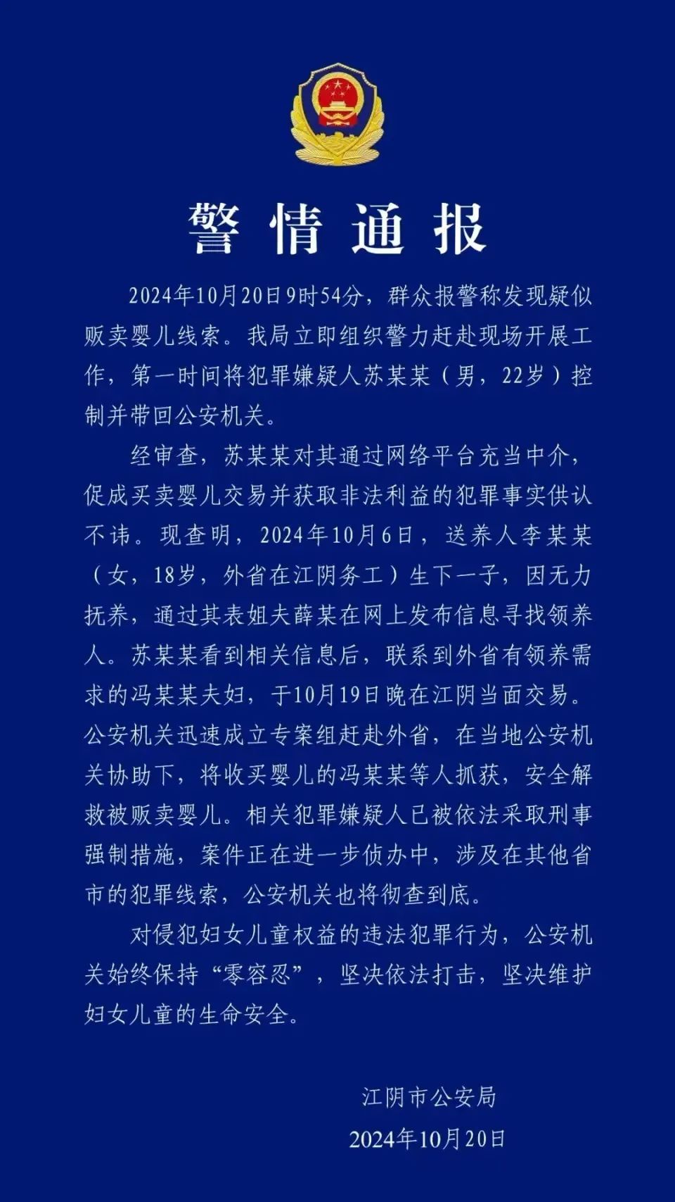 据江阴公安通报,18岁在外务工的李某某生下一个孩子,因为自己没有抚养条件,所以委托亲属在网上发帖寻找领养家庭。这条信息被“职业送养中介”苏某某看到,在其介绍之下,与外省一对想要领养孩子的夫妇达成金钱交易。