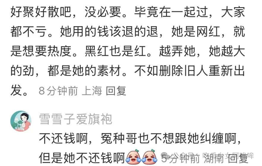 正文 大哥曝女网红花了自己1300w,恋爱期间还出g,女网红回应其又老又小,心眼多!引发网友热议! 最新吃瓜网 V管理员 /2024-12-06 /1182 阅读 1206 最近瓜在晚上冲浪的的时候看到了某位网红田鼠的大哥怒斥田鼠大哥说田鼠和自己在一起期间出g自己发现以后田鼠就哭着说如果大哥和自己分手自己就没有钱继续留学了大哥心软就不分手随后还支付了女方的学费和生活费留学期间还花了自己500w其父母都没有见过自己完了以后大哥还给田鼠的父母买了名牌包包还有各种大大小小的生日蛋糕酒店还给其父母交了长达四五年的社保如今却换来其家里的一句不熟悉没见过田鼠嘴里说着一句自己是对其最好的男人如今对其也是各种 诋毁请问田鼠是表演型人格吗?随后大哥还说已经把其告上法庭法院要求其归还570w但是田鼠只归还20w随后田鼠回应说自己可以归还大哥买的车和房也愿意归还这570w只是自己钱不多所以要20w20w的给不是说只还20w大哥说的房车其实是自愿赠与的说是给自己的礼物 一共193w田鼠出了62w谈恋爱的时候你自己说房子车子都是无条件赠与的但是现在却要自己归还自己同意了但是你还是继续网暴谈恋爱的时候偷拍了女生的果照然后威胁女生父母随后两个人就分手了仍然坚持两个人还有恋爱关系这也是单方面的完了以后女生谈恋爱了 大哥不相信就说女生是出g甚至某一段时间大哥不能出国探访女生原因其实是大哥涉嫌经济诈骗无法出国知道了女生不愿意继续在一起就让女生还钱其中账单还有大哥给自己点的外卖不少网友评价二人可以算是旗鼓相当一个贪财一个好色既然女生的都愿意还钱了就不要继续网暴别人了但是大哥肯定觉得不值得毕竟是自己奔着结婚去谈的不是请问在哪里能遇到这种心软的大哥啊对此你有什么看法欢迎在下面留言我们一起来交流一下好啦!今天的八卦就到这里了!每天动动大拇指!点赞在看不麻烦!阿瓜发文有动力!大家明天见!