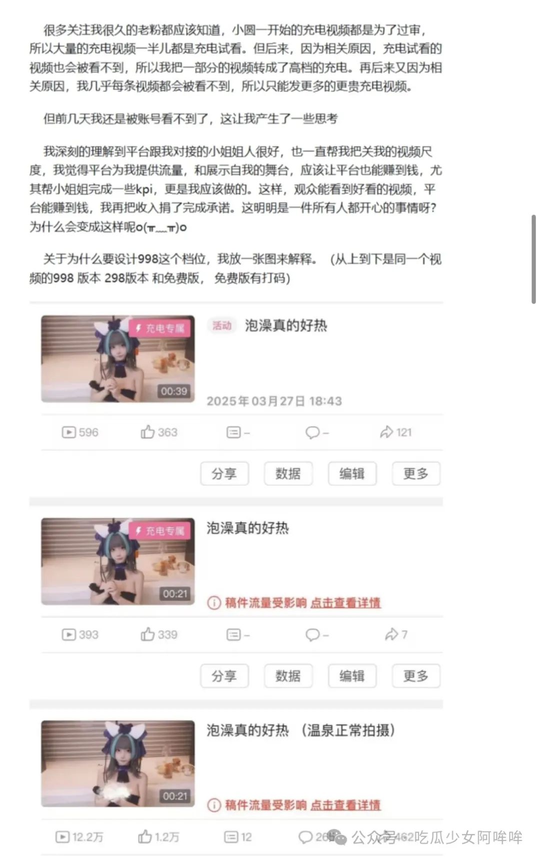 正文 某站女Coser推出998元充电包月擦边视频套餐,称赚的钱都会全部捐出,自己不圈钱,引发网友热议! 最新吃瓜网 V管理员 /2025-05-01 /1221 阅读 0501 大家晚上好啊今天瓜想跟大家说的人物就是女coser小圆她是一名coser经常出一些非常漂亮的角色她本人本来在互联网上没有太大的波浪就是很漂亮一个小女生也不会遭受大家的议论能赚钱能出角色还能有收益不过最近因为小圆的一个举动推翻了她原本平静的生活最近小圆在某站上开通了一个名为998元充电包月活动这个活动一出来立马引发大家的热议不少网友表示这个意思就是明着擦边然后还要收费不过肯定有人愿意买单的对于这个定价问题小圆称是因为免费的版本收费298会被限流所以被迫收费998瓜表示非常的震惊收的少会被限流但是收的多就不会这种道理还是头一次遇见随后网友们还称这个小圆不会是皮套人吧那么漂亮看起来不是很真实如果视频也是ai合成的感觉卖998真的不合理吧对此小圆本人回应称自己是一个实打实的真人自己本来没有打算假如cosplay就只是喜欢cos而已去年才加入的这个圈子自己以后会更加努力的做妆造尽量的提高自己的cosplay的技术给大家带来不一样的自己关于出售视频定价自己还想要说自己不是什么慈善家然后每天努力拍摄完了以后付出这么多心血如果不赚钱的话肯定没有人愿意为爱发电的目前自己就想要有更多的粉丝来喜欢自己早日成为百万up主这样就会有更多的活动来邀约自己了还有因为某些视频不发电是发不出去的其实自己本意没有想要靠这个赚钱主要是现在不充电发不出去自己也没办法所以希望大家能够理解自己自己将做出一下承诺就是会将赚来的钱每个月的收益捐出去之前也捐了一共提现了5000多全部都捐出去了平台很好为自己提供流量但是自己应该为大家负责就是想要大家能够看到最完美的自己展示所以就想到了充电收费这个事希望大家不要介意免费版的有打码298和998版本也不一样喜欢自己的人会愿意看不喜欢的人自己求也没有用所以完全是看个人的这件事情让很多人不满意自己只能说抱歉自己以后会努力做好的不少网友评价确实是有人愿意买单的不喜欢就算了但是看她真的很像ai假人但是她的视频质量真的很高